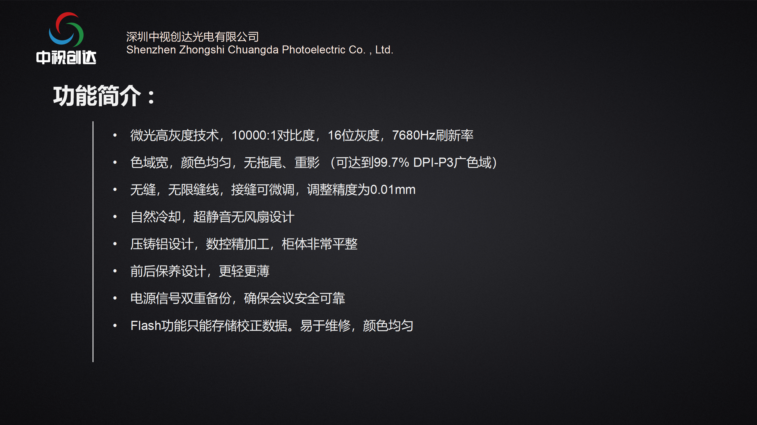 微光高灰度技術(shù),10000:1對比度,16位灰度,7680Hz刷新率色域?qū)?顏色均勻,無拖尾、重影(可達到99.7% DPI-P3廣色域)無縫,無限縫線,接縫可微調(diào),調(diào)整精度為0.01mm自然冷卻,超靜音無風(fēng)扇設(shè)計壓鑄鋁設(shè)計,數(shù)控精加工,柜體非常平整前后保養(yǎng)設(shè)計,更輕更薄電源信號雙重備份,確保會議安全可靠Flash功能只能存儲校正數(shù)據(jù)。易于維修,顏色均勻